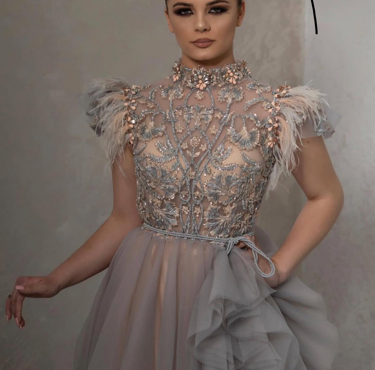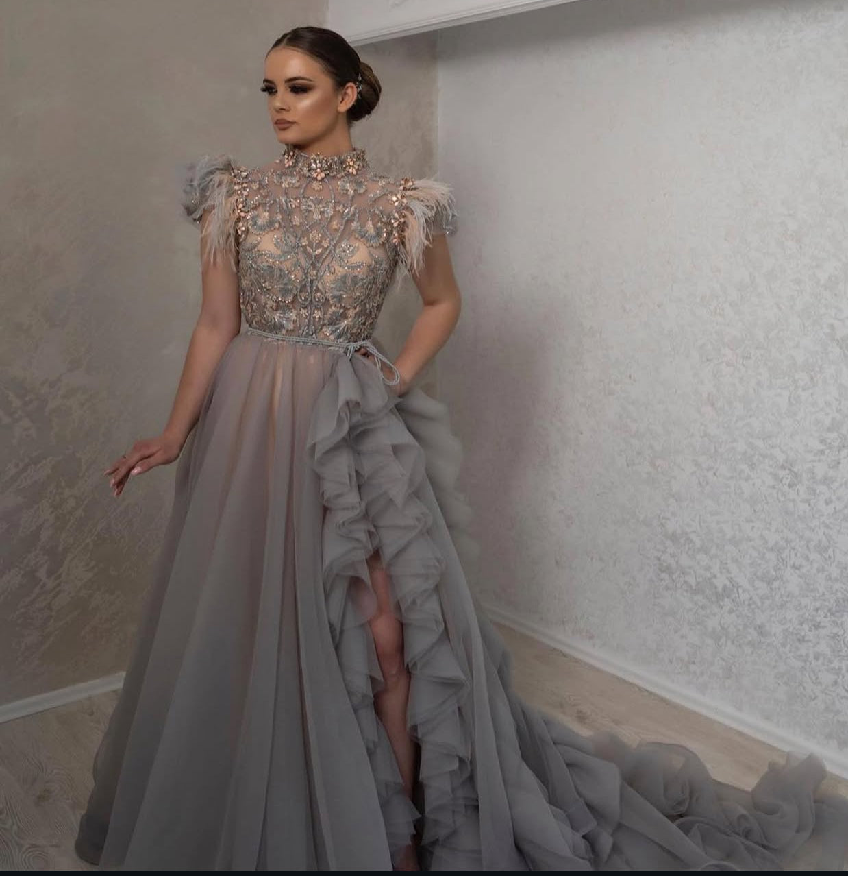 A long and voluminous dress with split in the front for added definition. The top of the dress has a high neck and includes stunning details. Material: Polyester