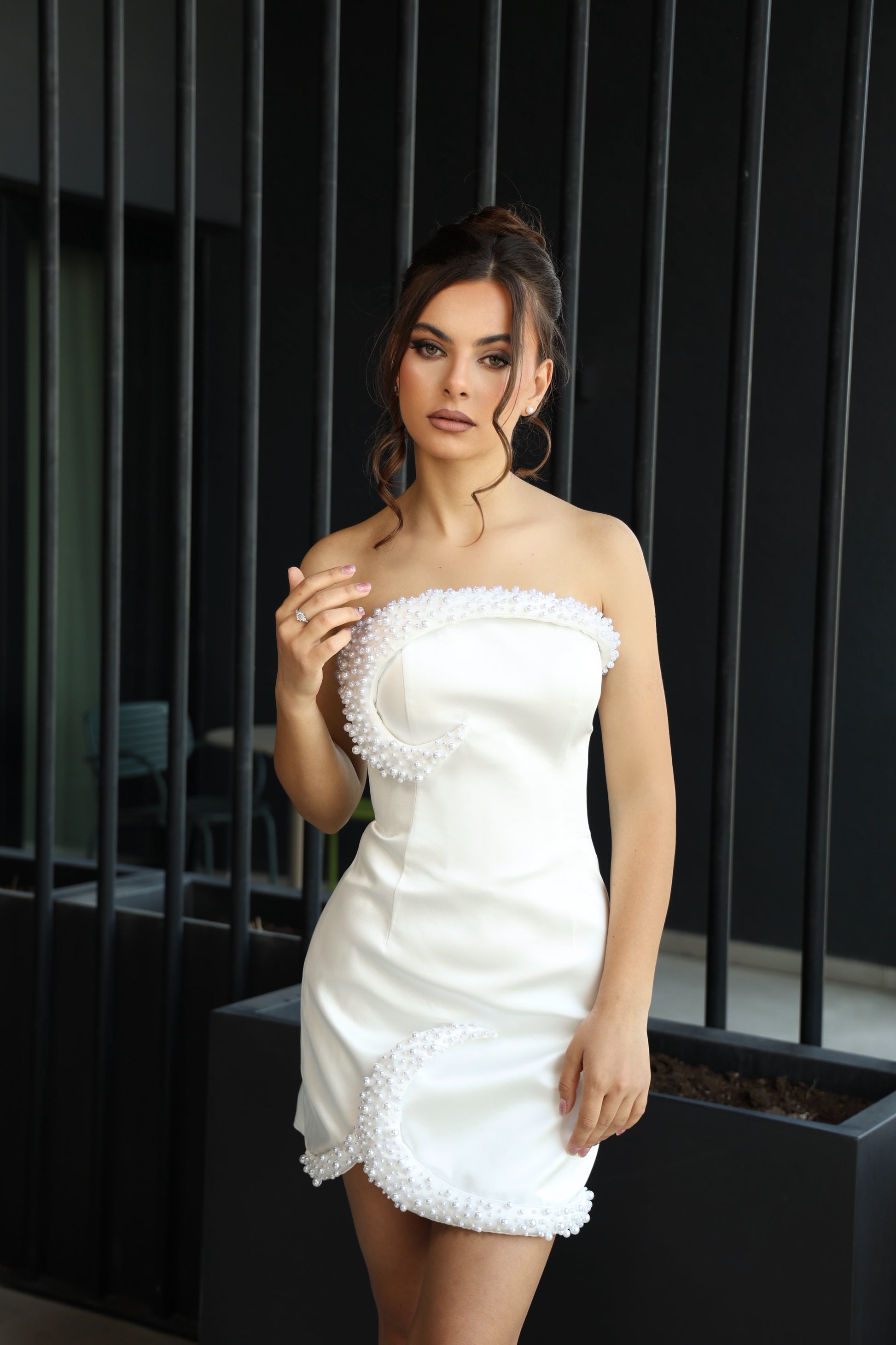 For the bride who wants to shine at the reception after the big ceremony, this beautiful short satin wedding dress is the perfect choice. The dress combines elegance and style with a stunning corset adorned with delicate pearl details. This dress will ensure that you continue to radiate, while adding a playful touch to the celebration.