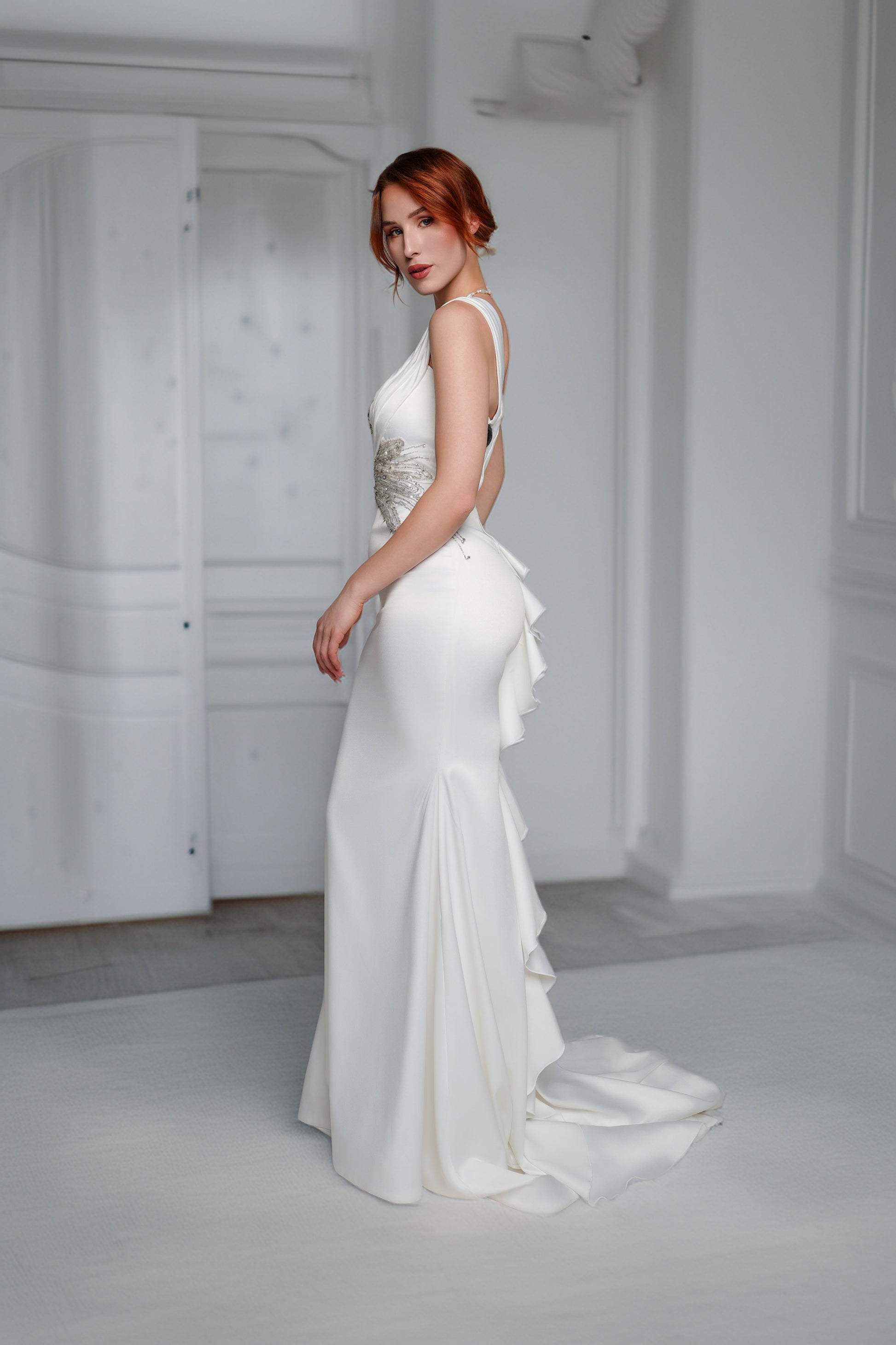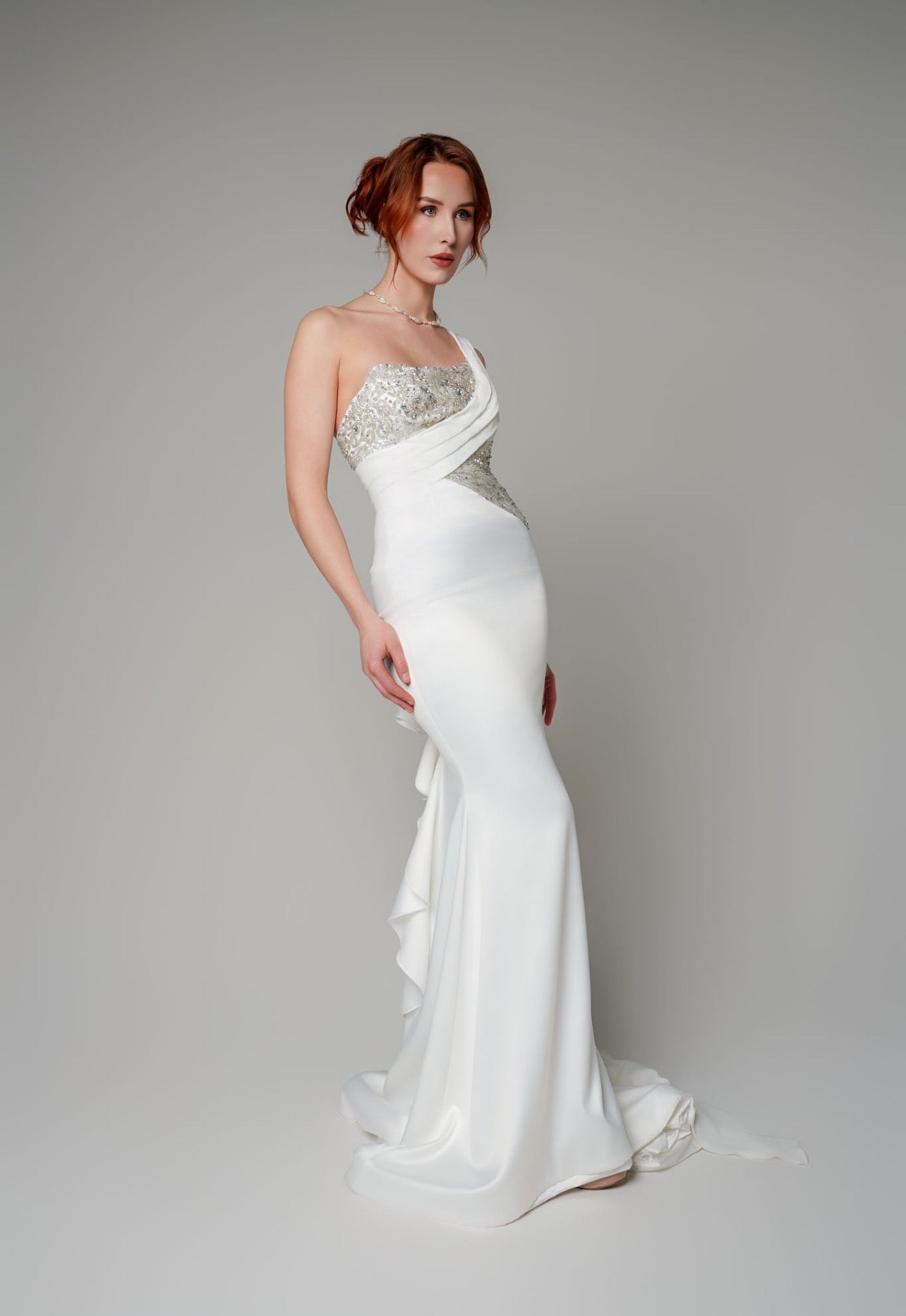 The silky smooth satin drapes elegantly, creating a sophisticated silhouette that enhances your natural beauty. The bodice is adorned with delicate, hand-sewn details