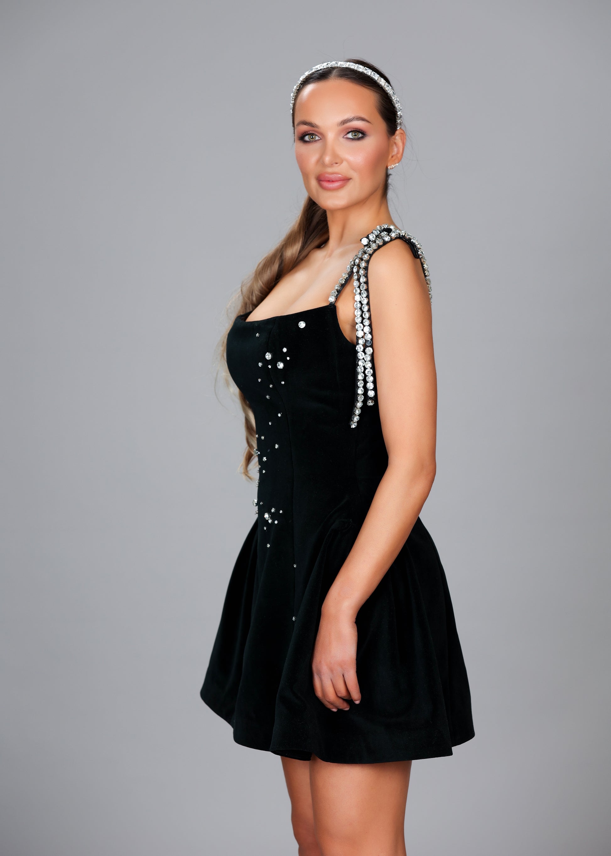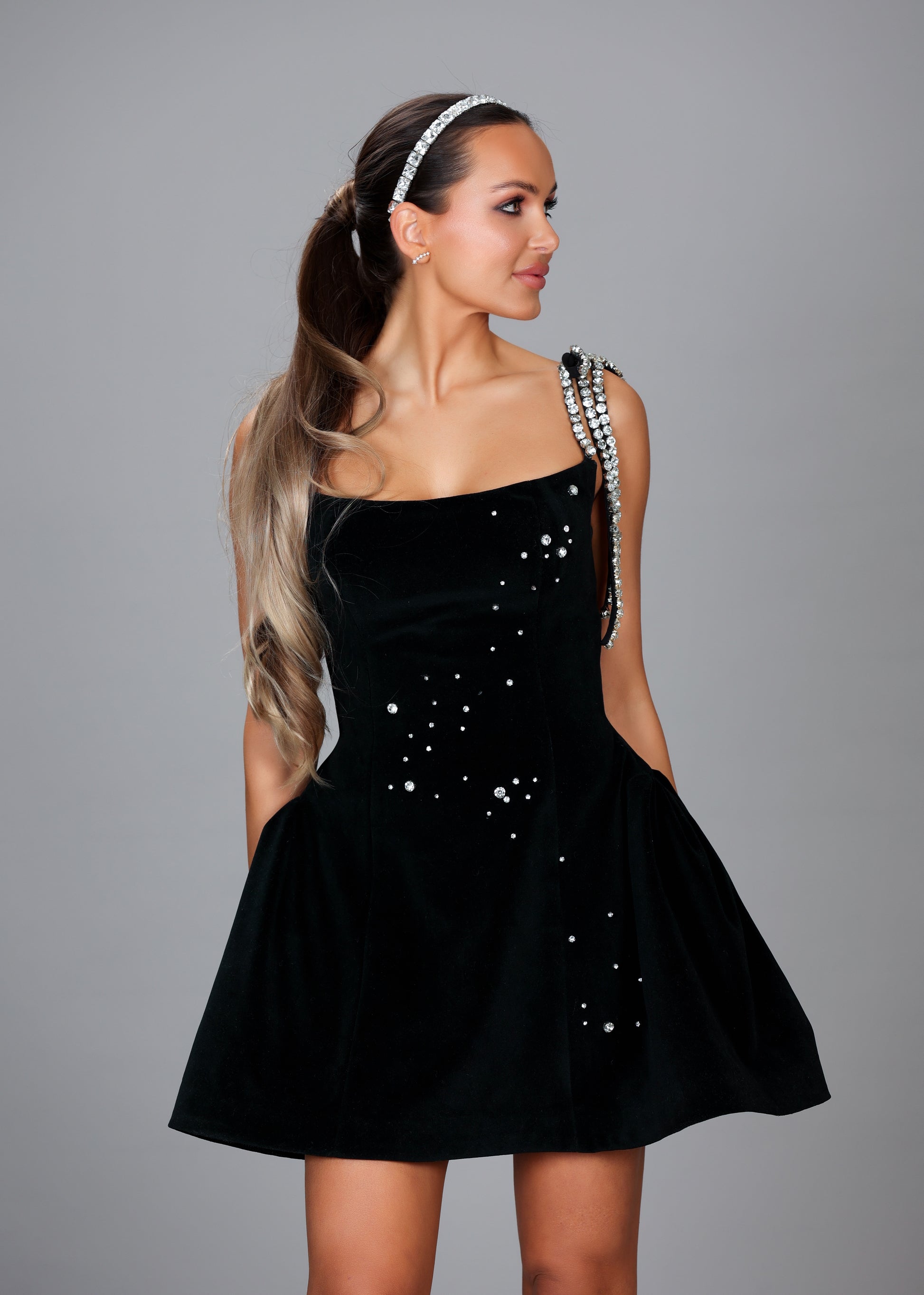The dress of your dreams — our new contemporary silhouette sculpts elegant curves at the sides in soft velvet, embellished with hand-sewn, sparkling stones. Perfect for the evening’s big moments