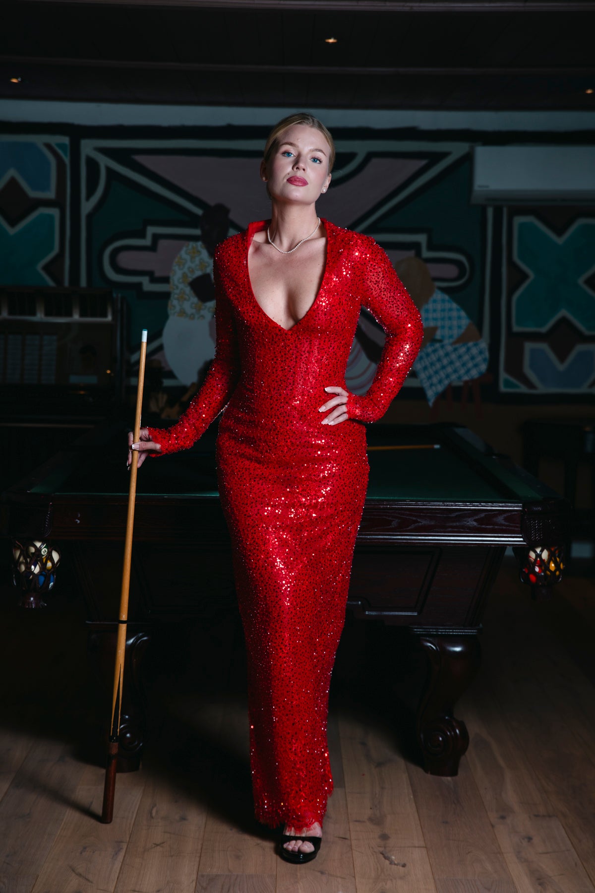 The dress is adorned with glittering sequins from top to bottom, and its elegant mermaid silhouette embraces and accentuates your curves in the best possible way. For optimal shape and support, the dress is equipped with an integrated corset. Do you wish to intensify your waist and create an even more defined silhouette? Then you'll love the extra corset that comes, with it designed to give you the ultimate hourglass figure!