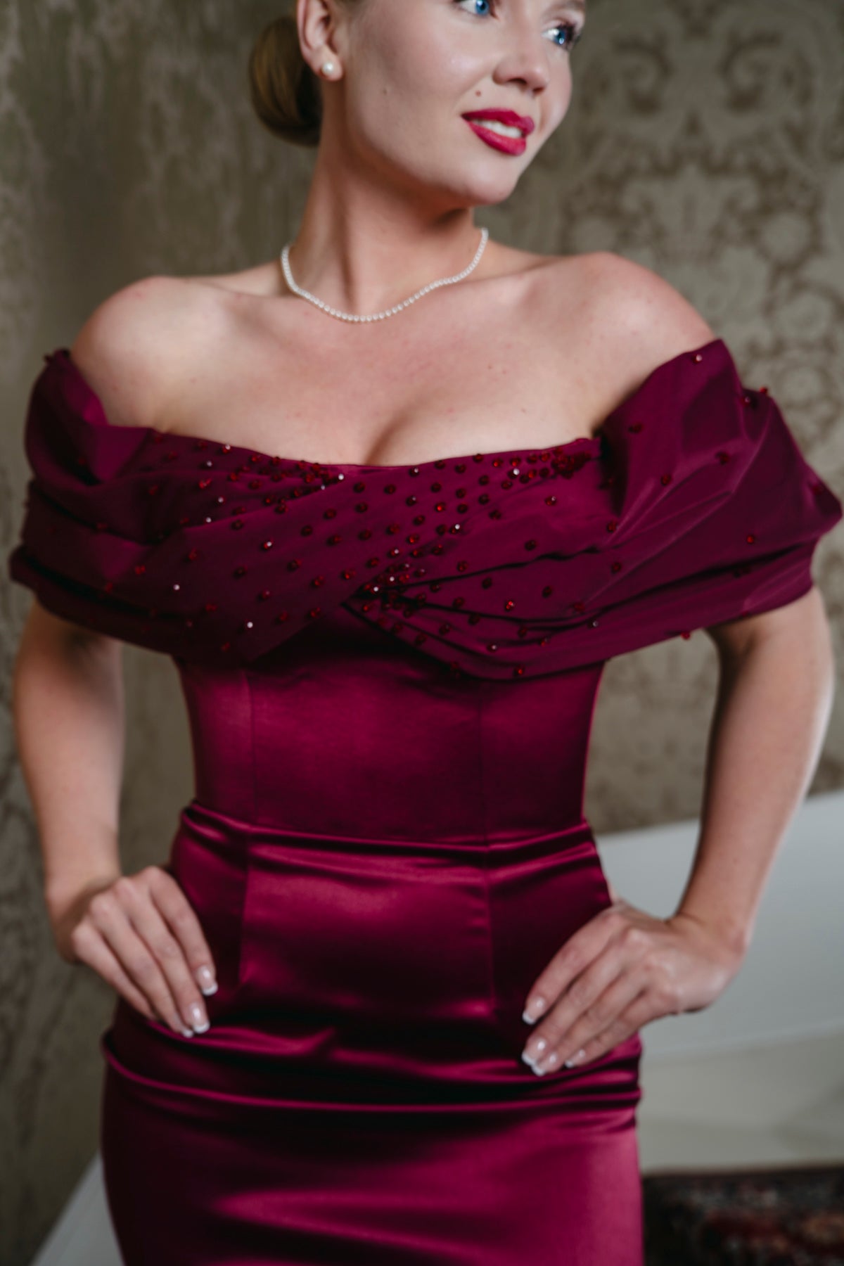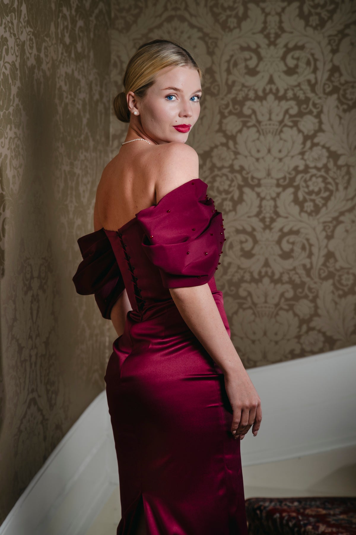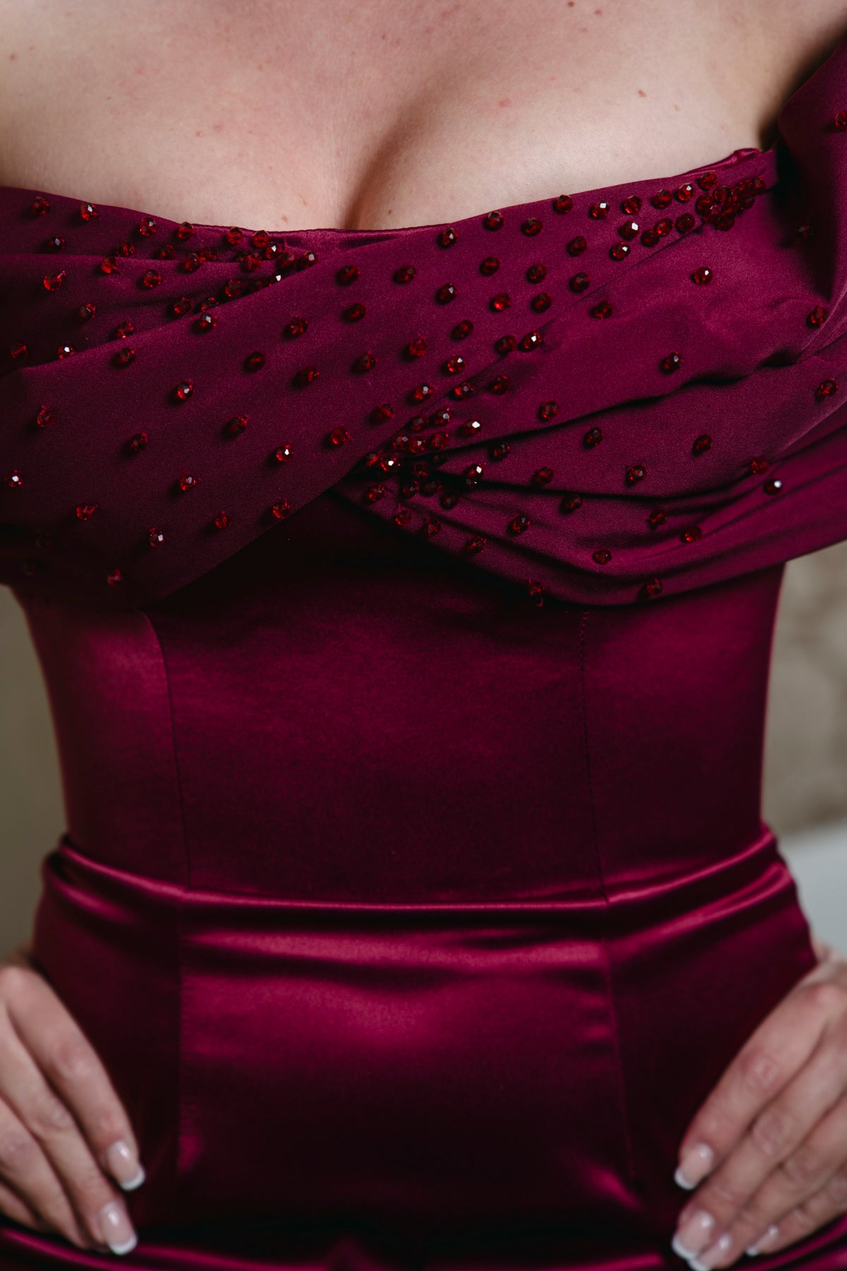 The feminine draping around the shoulders creates a flattering and unique focal point, while the small, hand embroidered stones are discreetly sewn in to catch the light and add a touch of subtle glamour. Each stone is meticulously placed, testifying to true craftsmanship and attention to detail.