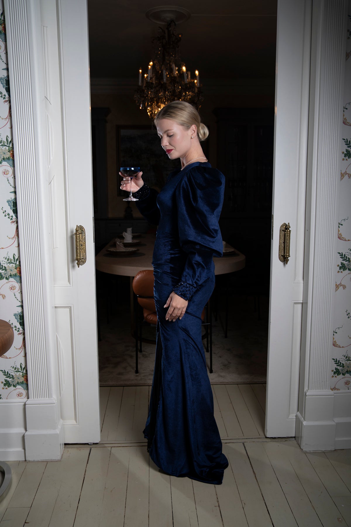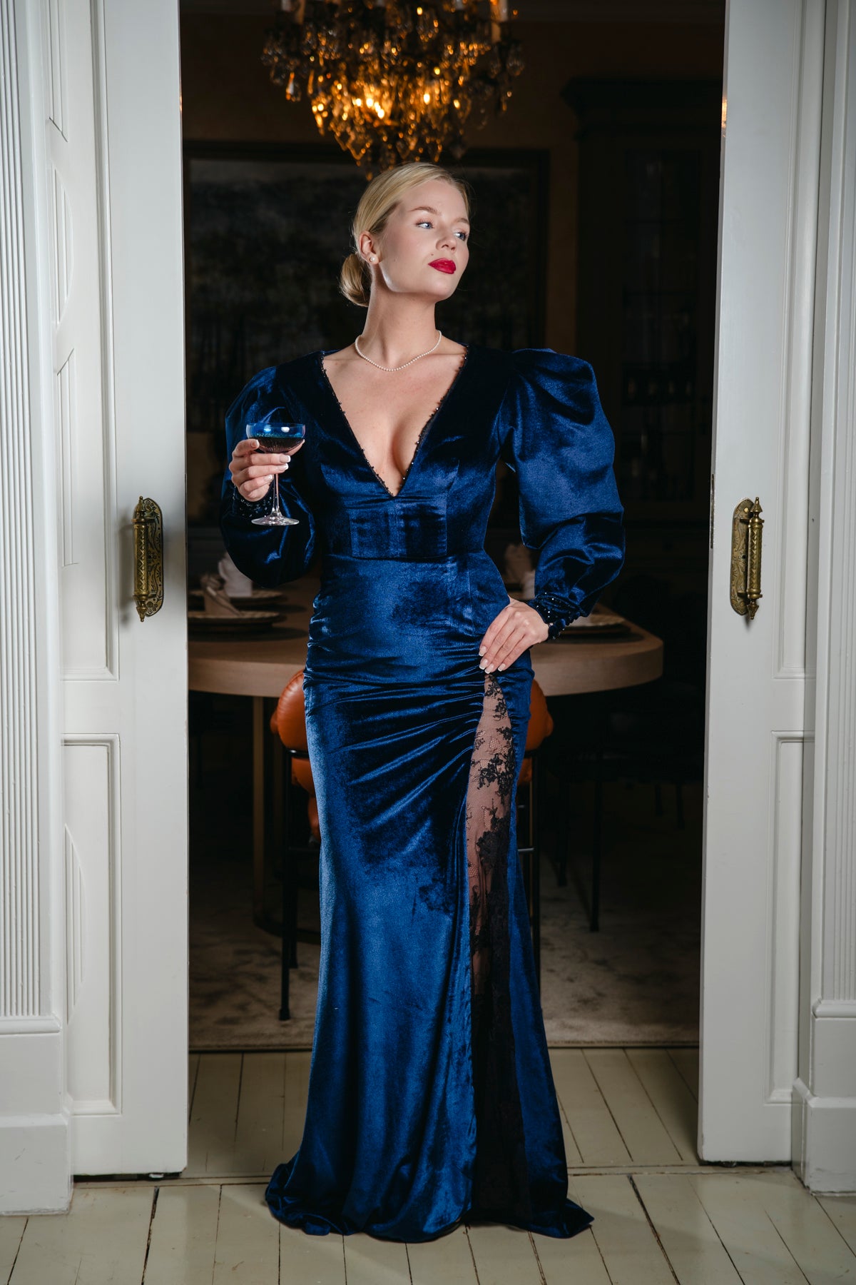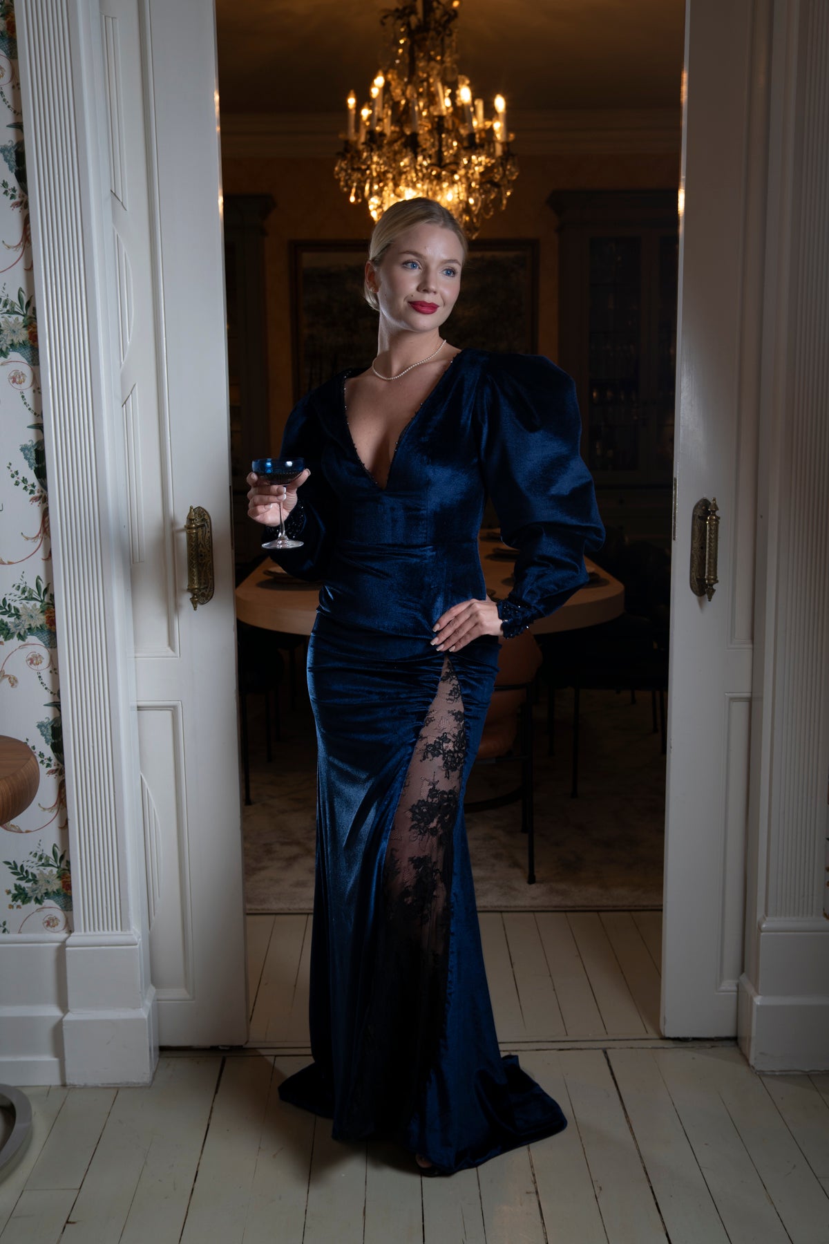 This velvet dress is a master of balance its rich texture and plush lace details exude sophisticated style, while the voluminous puff sleeves add a playful and confident touch. Perfect for feeling irresistible.