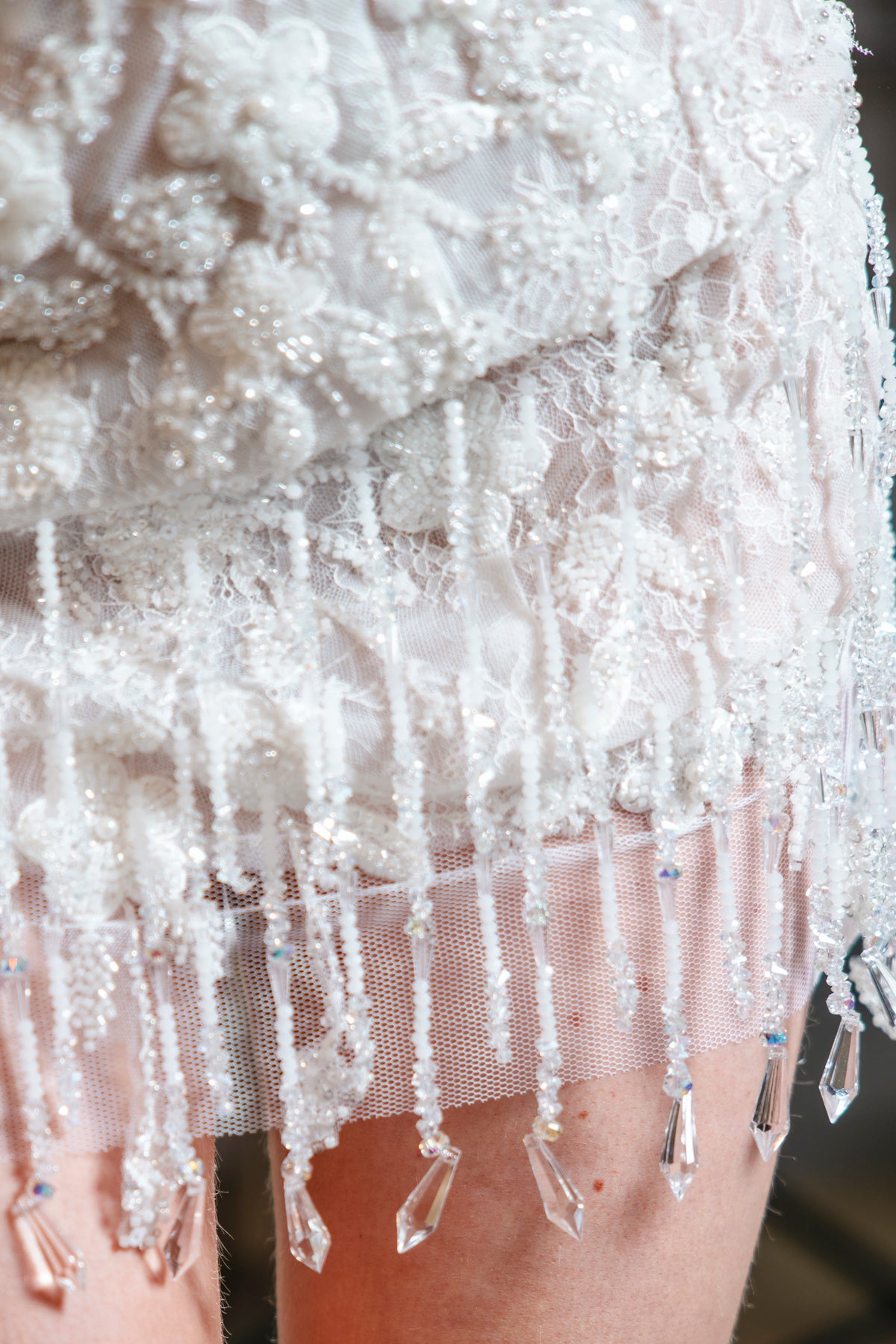 The dress is a masterpiece of details, featuring intricate pearl embroidery and exquisite fringes that dance elegantly with every movement. Its strapless silhouette gracefully highlights the shoulders and décolletage.