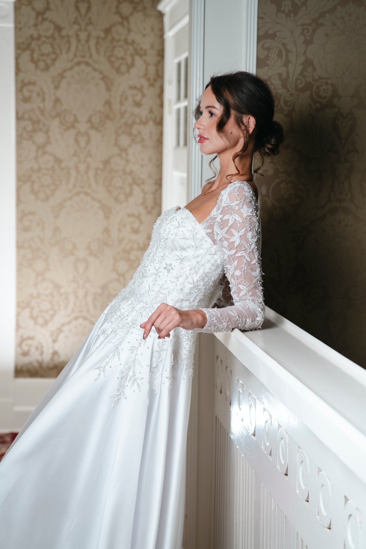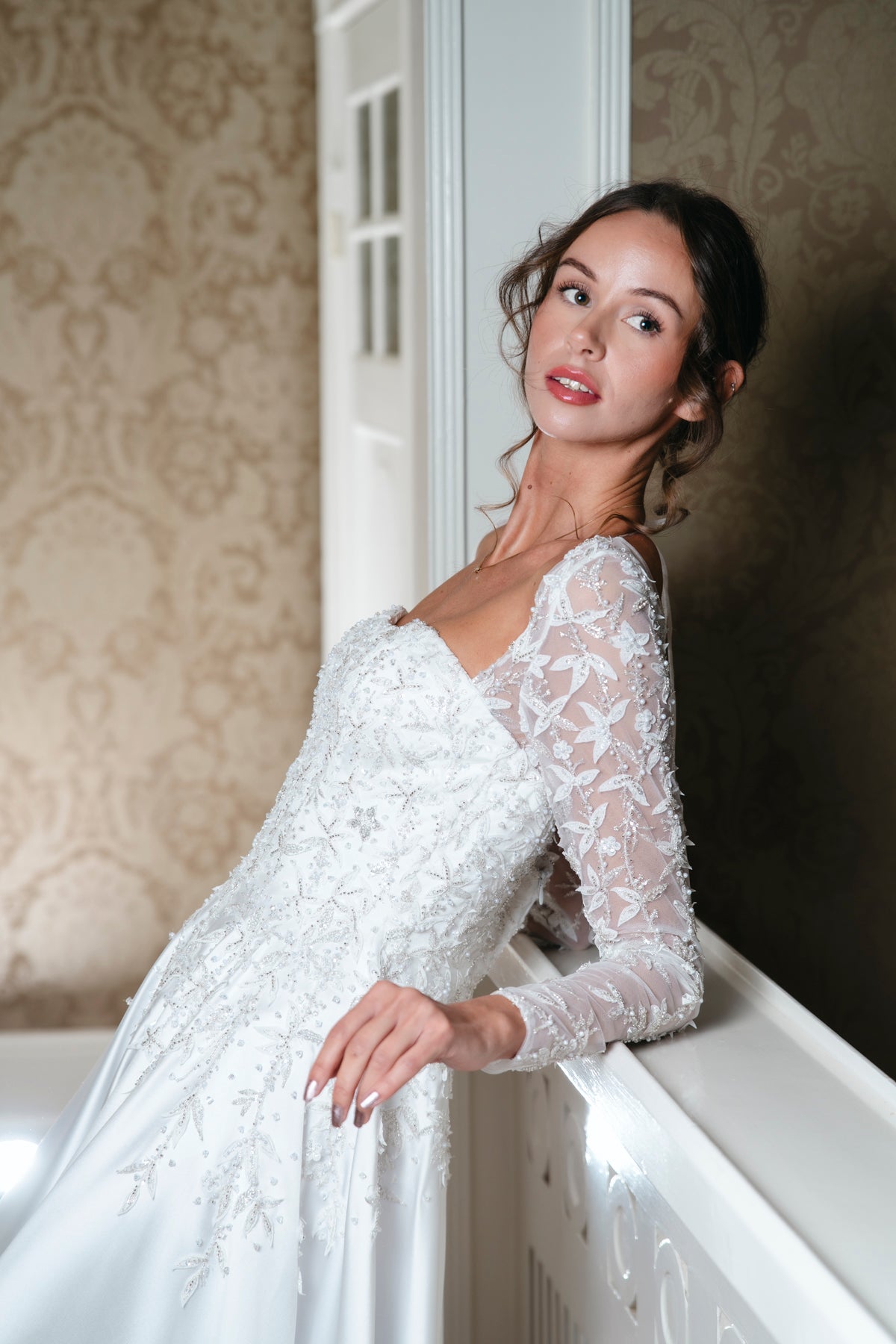 Clara is the perfect choice for the classic bride. Its elegant A-line skirt and heart-shaped, handmade corset cinches and accentuates the waist for a flattering silhouette. Embrace timeless beauty on your special day with Clara.