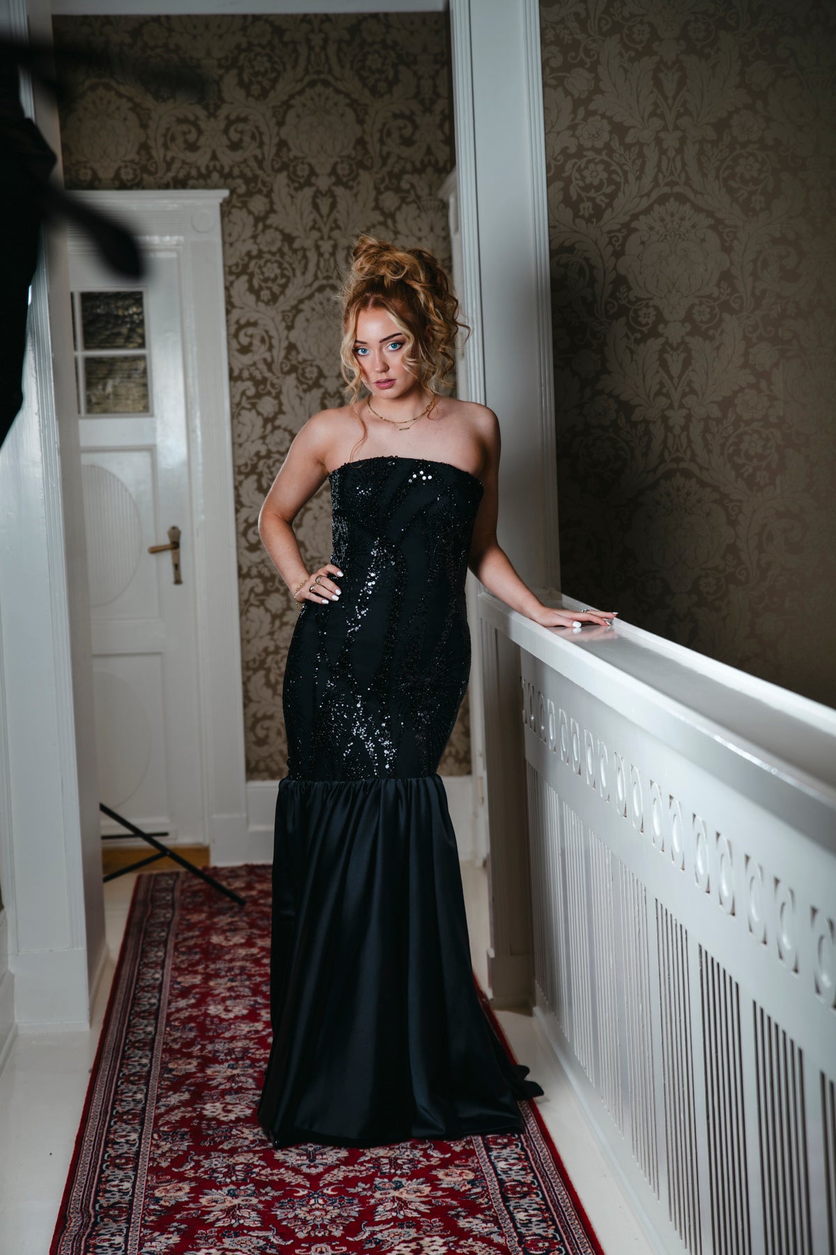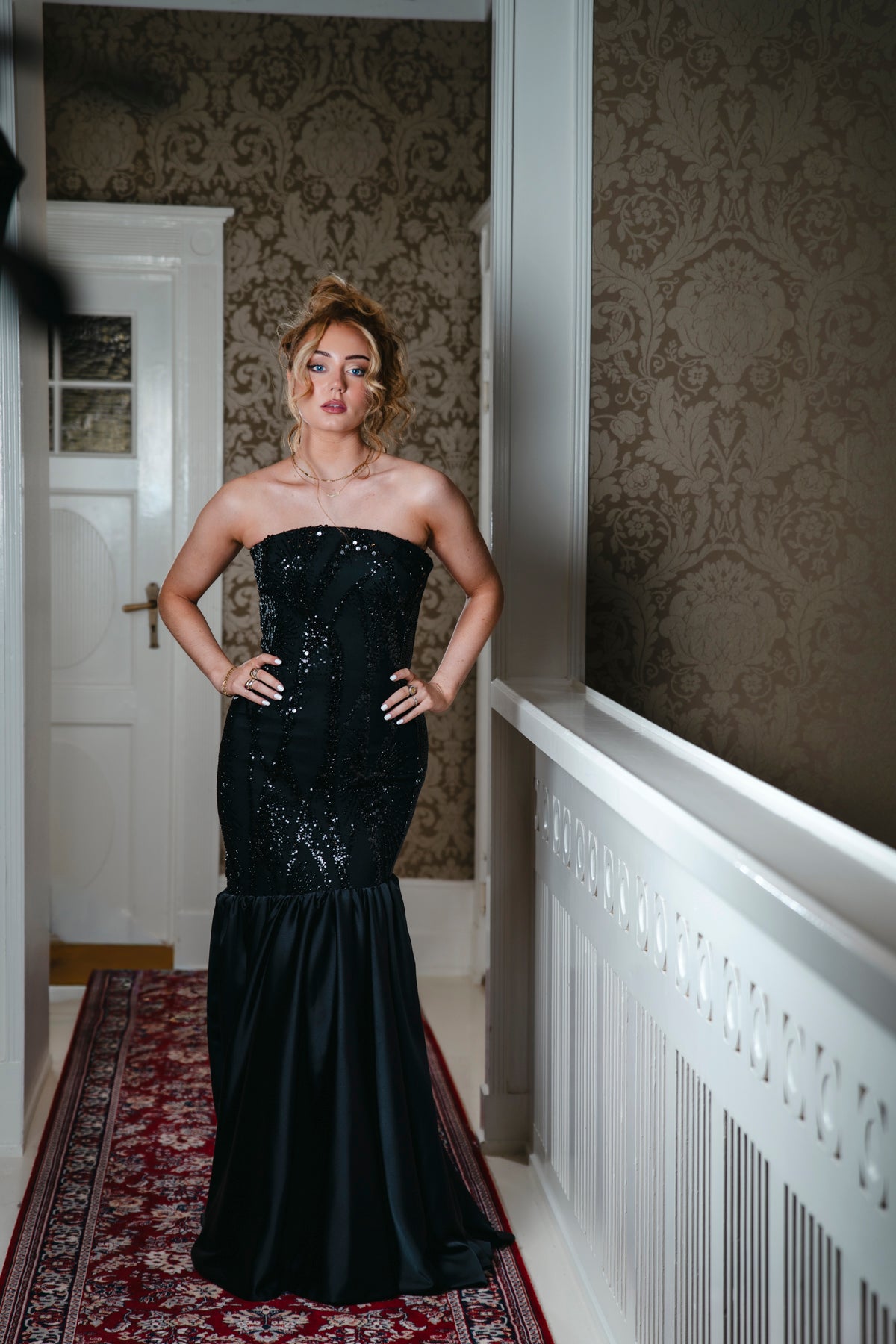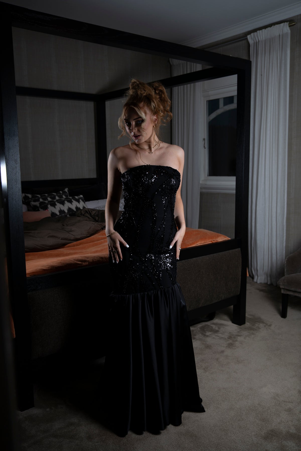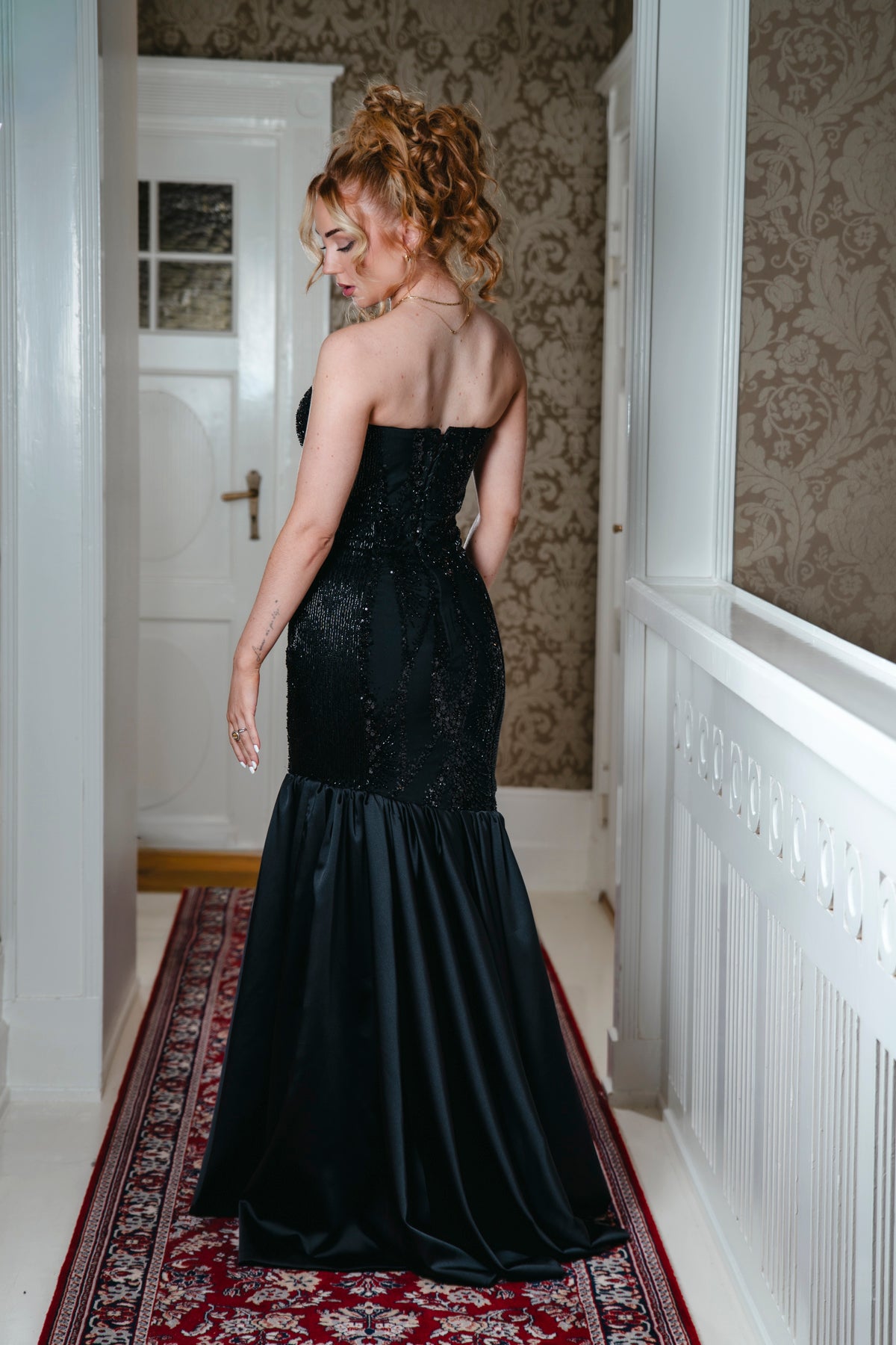 Below the corset, a flowing, relaxed skirt drapes beautifully, giving the gown an elegant and chic fall. The gentle movement of the skirt balances the structured corset and the glittering panels, ensuring the dress is both eye-catching and incredibly comfortable to wear.