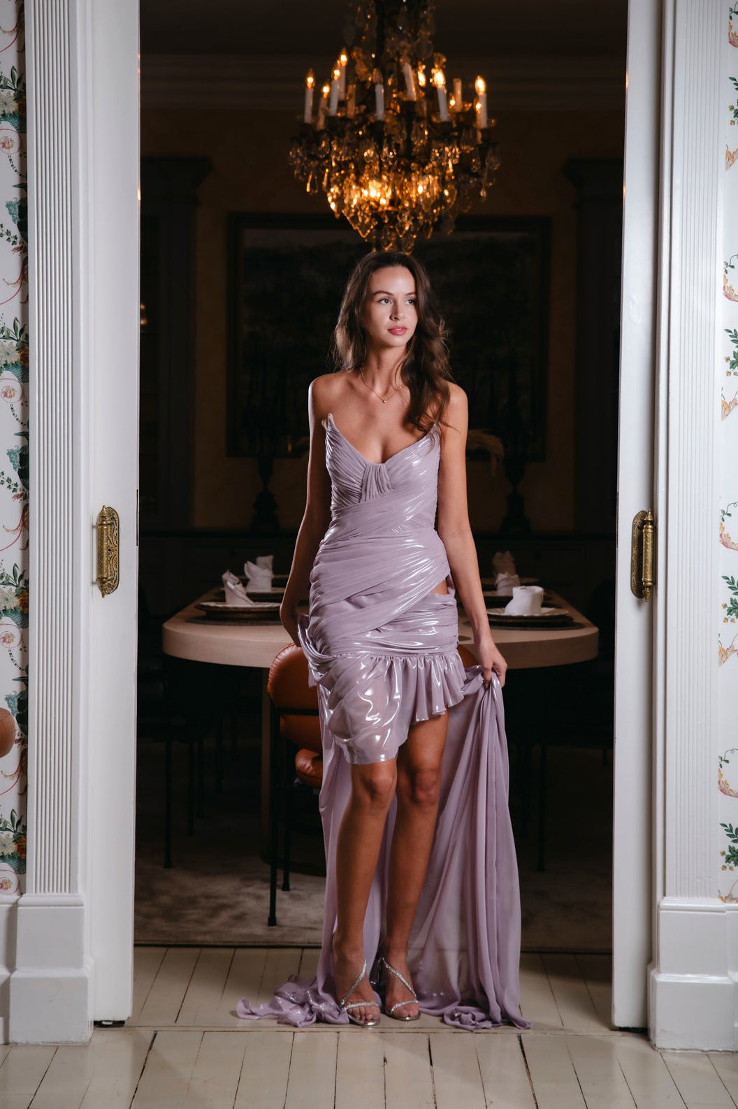 The light and airy fabric ensures maximum comfort, whether you're dancing the night away or mingling. With a stunning corset tailored to define and accentuate your figure, you will feel both confident and beautiful. The dress is enriched with rich, exquisite draperies that fall elegantly both front and back, adding a touch of luxury and dynamism to your look.