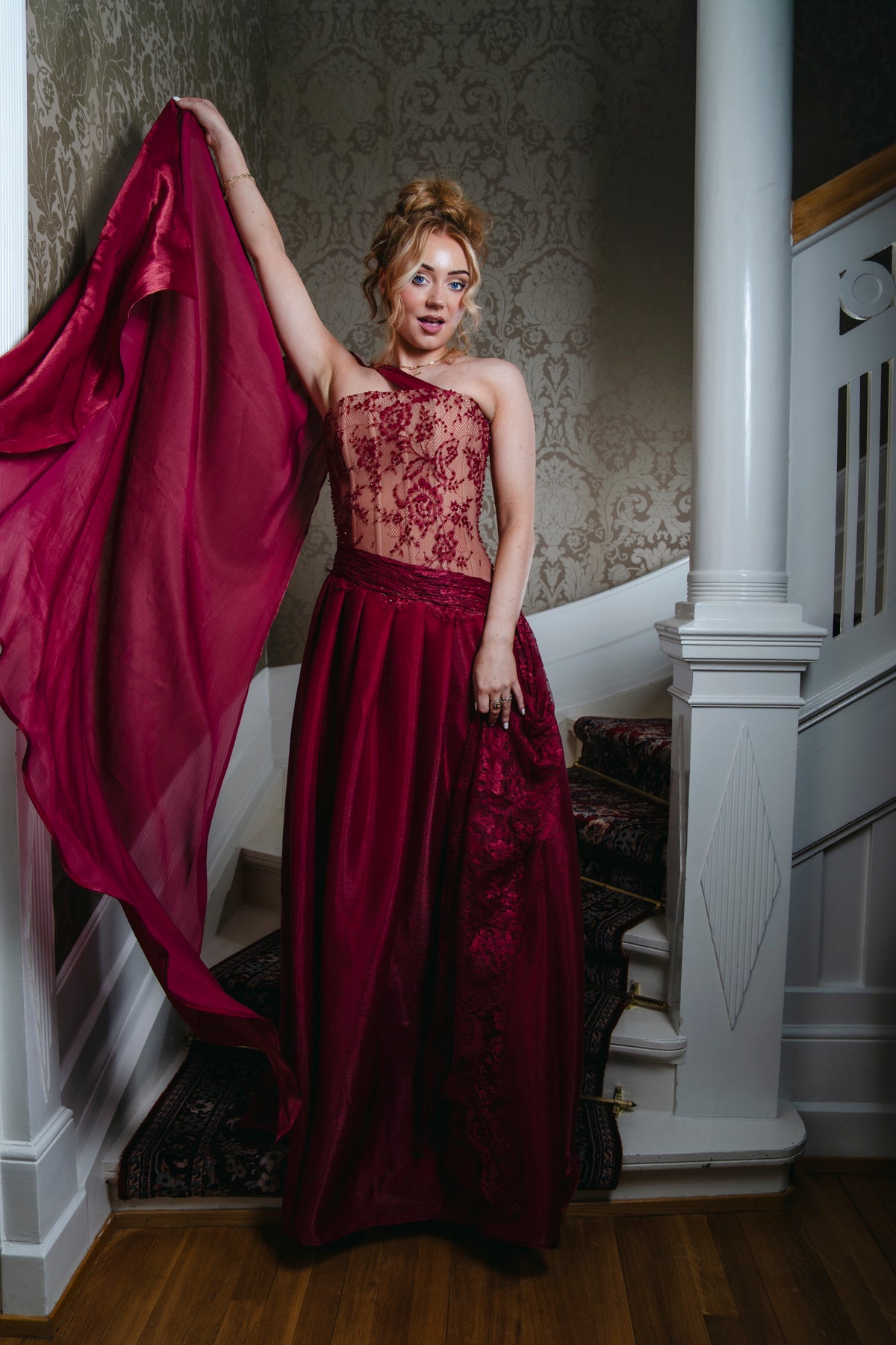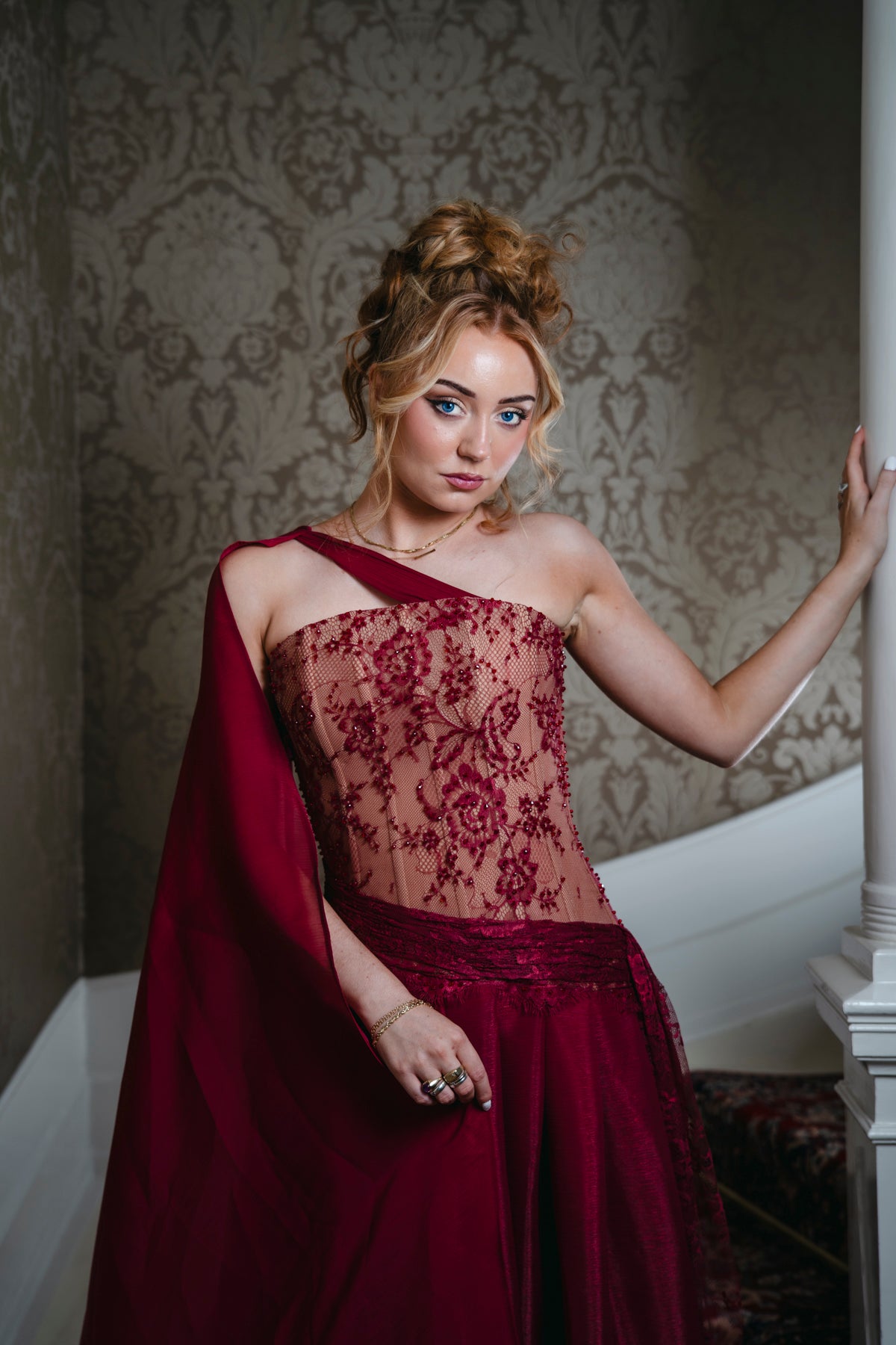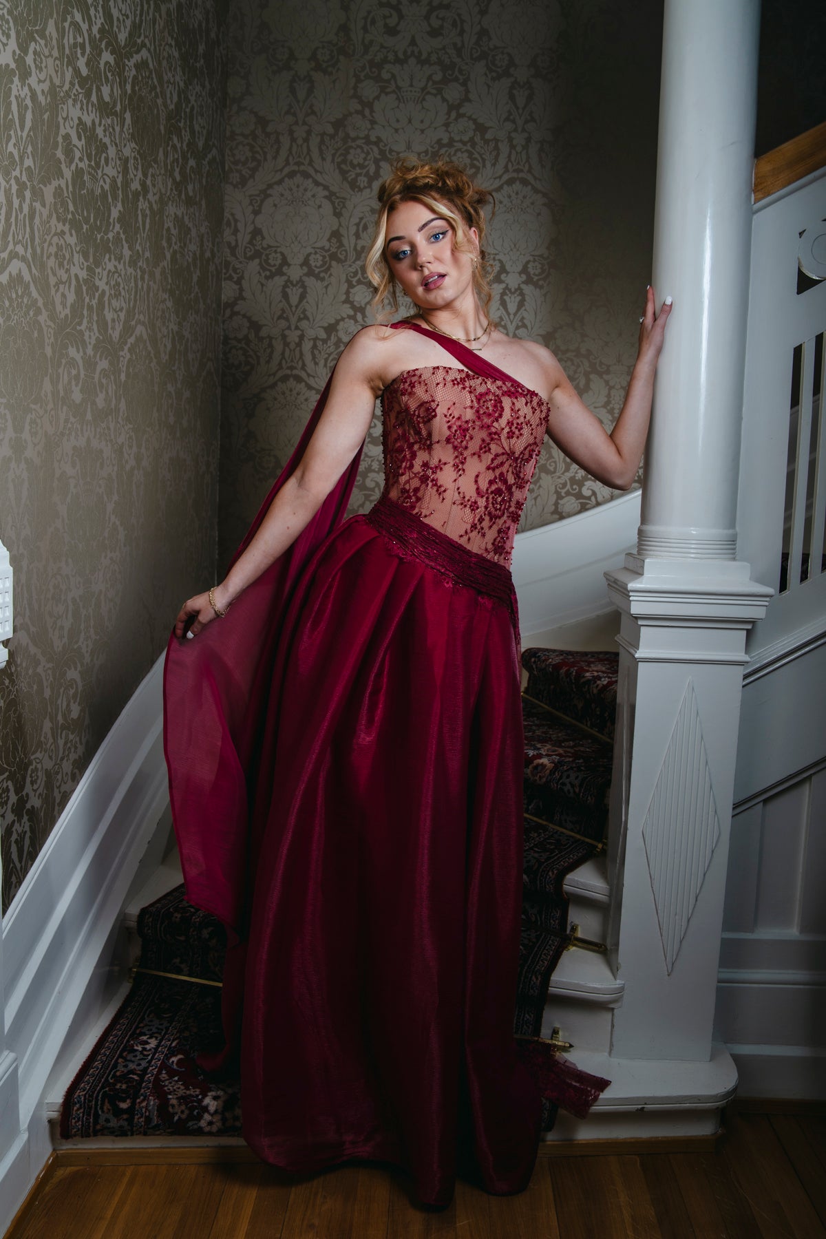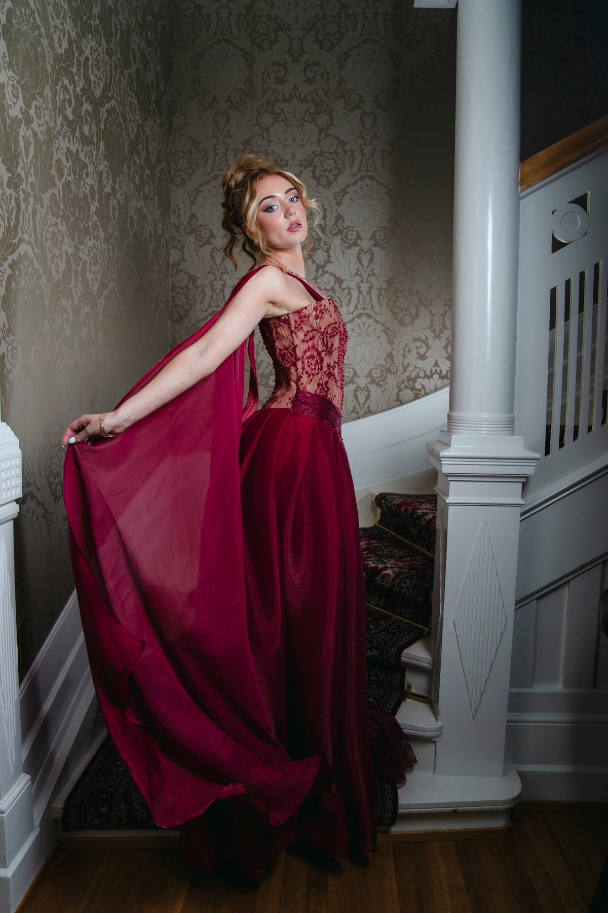 With a perfectly sculpted handmade corset that accentuates your figure, and a voluminous, flowing skirt that sways elegantly with every step. The delicate French lace adds a touch of timeless romance, while the unique shoulder train provides an unexpected, majestic twist.
