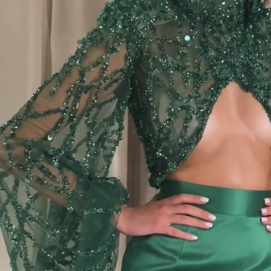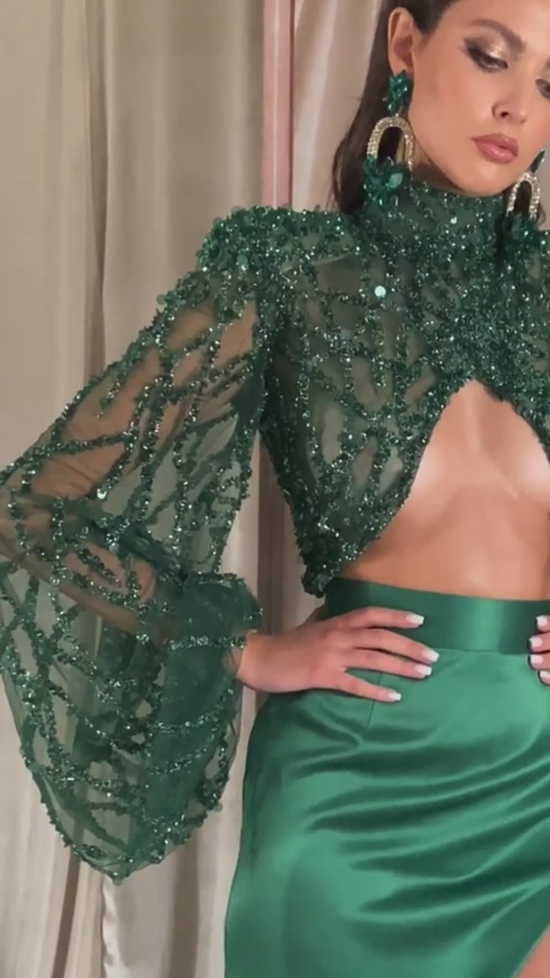 Themmy is a stylish two-piece set with a glittery top and a satin skirt. The top features loose arms while the skirt adds a touch of elegance. Perfect for any special occasion, this set is both elegant and glamorous, making you stand out in the crowd.