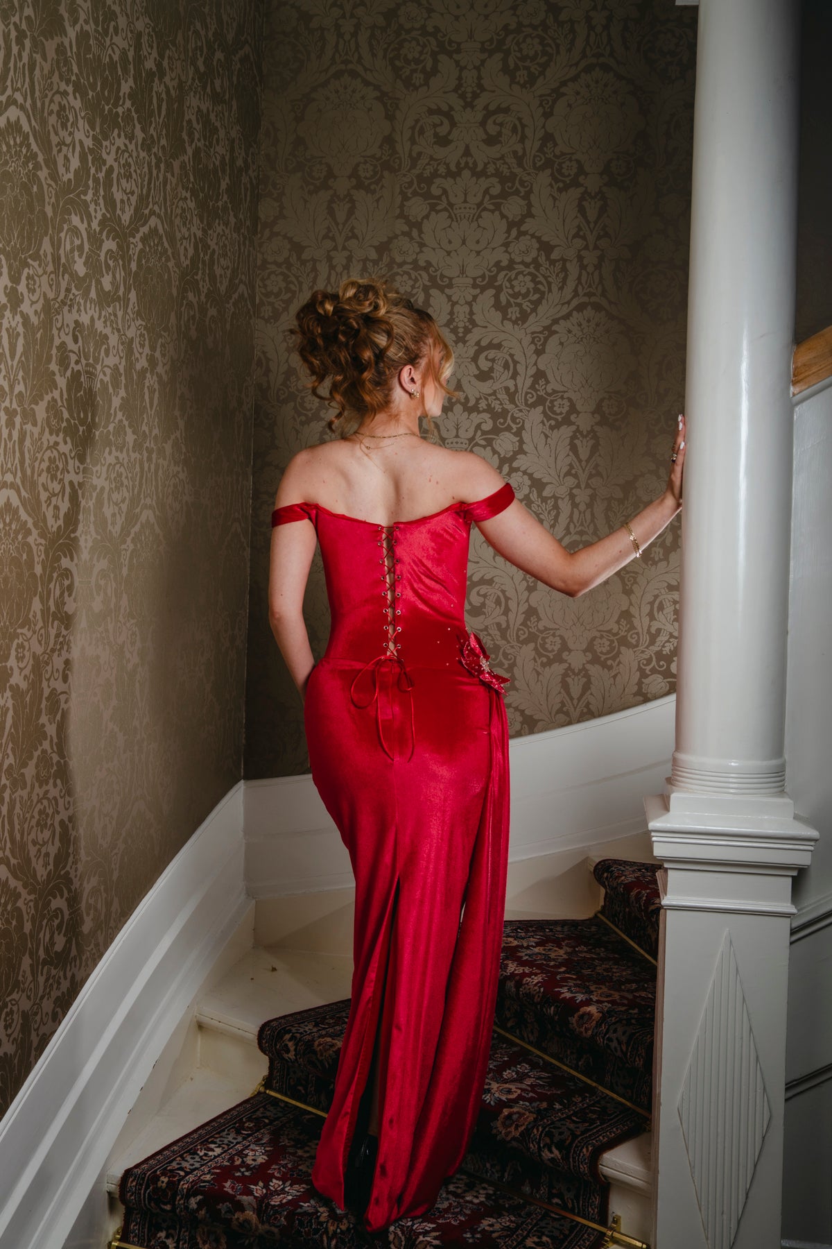 Discover a masterpiece that defines timeless elegance and exclusivity. This gown, crafted from deep, captivating red velour, is designed to command attention and enchant the senses.